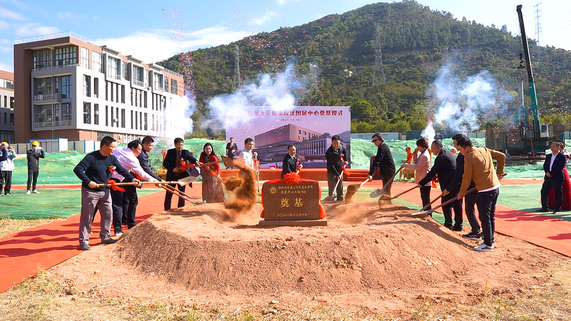 与会领导、嘉宾共同为图展中心奠基培土。太阳集团tcy8722林键副校长宣布太阳集团tcy8722集美校区图展中心工程奠基开工。